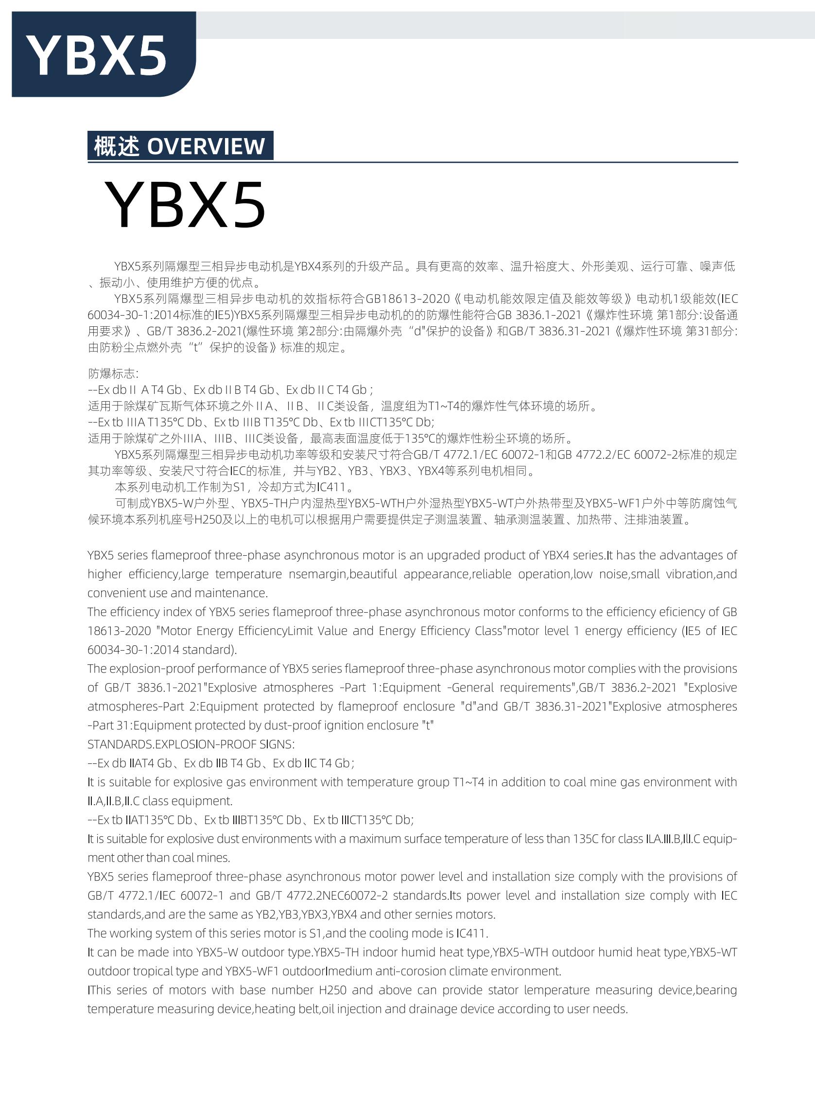 YBX5系列隔爆型三相異步電動機功率等級和安裝尺寸符合GB/T 4772.1/EC 60072-1和GB 4772.2/EC 60072-2標準的規(guī)定其功率等級、安裝尺寸符合IEC的標準,并與YB2、YB3、YBX3、YBX4等系列電機相同。